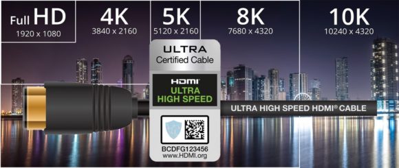 Für 8K mit 7.680 × 4.320 Pixel bzw. 10K mit 10.240 × 4.320 Pixel ist die Übertragung mittels „Ultra High Speed HDMI Cable“ vorgesehen. Nur mit diesem streng spezifizierten Kabel kann die Unterstützung aller HDMI 2.1-Funktionen gewährleistet werden. Die Datenrate des HDMI-Kabels beträgt dabei bis zu 48 Gbps.
