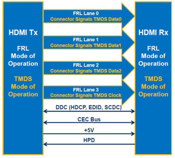 Dabei ist der HDMI-Stecker weiterhin rückwärtskompatibel zu früheren HMDI-Versionen. Das ist möglich, weil der TMDS „Clock Channel“ im FRL-Signal für einen vierten Datenkanal verwendet werden kann. Jeder Datenkanal wird außerdem mit verdoppelter Signalrate verwendet. Die vier Datenkanäle können mit einer Datenrate von jeweils maximal 12 Gbps belegt und so in der Summe 48 Gbps übertragen werden.