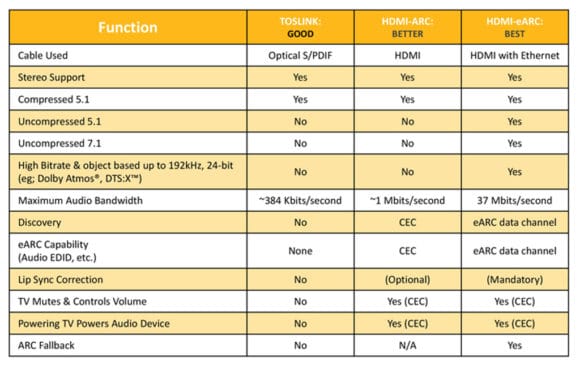 Funktions-Vergleich der verschiedenen Datenkanäle für die Audioübertragung per HDMI-Standard. (Bild: HDMI.org)