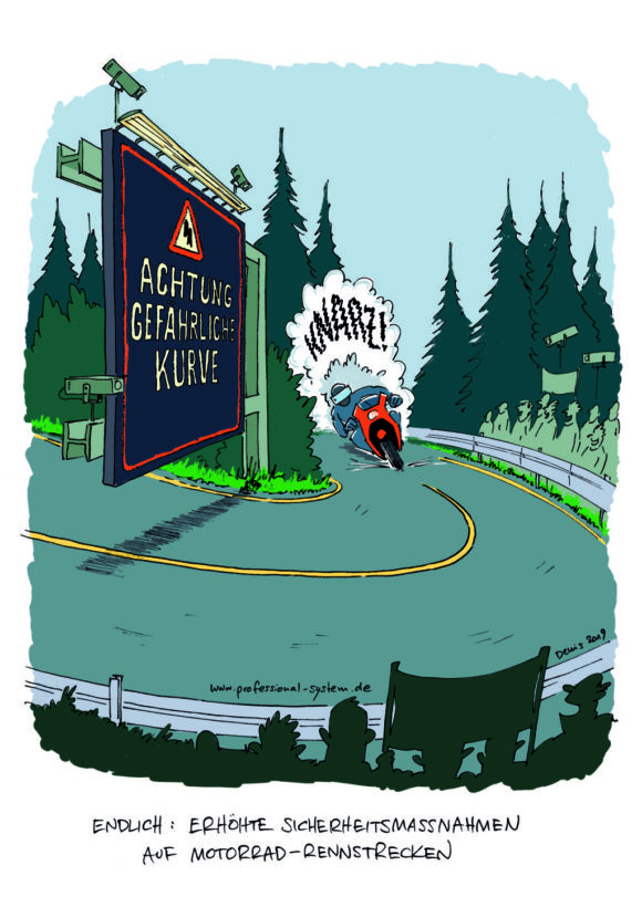 Für unser Special „Sicherheit und AV“ in PROFESSIONAL SYSTEM 5/2019 hat unser Zeichner Denis Metz eine eigene visuelle Interpretation der Case Study zu höheren Sicherheitsmaßnahmen auf der Motorrad-Rennstrecke in Misano angefertigt.