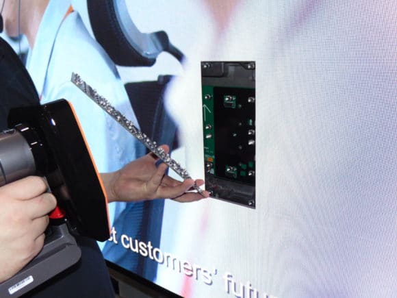 All-in-One LED Display-Lösungen für Konferenzräume, Unis, Lobbys, die auch als hochauflösende Informations-Werbeboard einsetzbar sind, werden immer beliebter. In diesem Segment hat Absen Absenicon im Portfolio. Die schlüsselfertigen, 4K-fähigen LED-Monitore mit eingebauten Signalprozessor, sind fertig kalibriert, bestückt mit Black SMDs mit 1,27 mm PP bis 2,5 mm PP und in Größen von 110″ bis 220″ inklusive Wandhalterung und Displayrahmen erhältlich. Das 220″-Model 4K220 hat mit seinen 1,27 mm PP sogar eine Auflösung von 3.840×2.160 Pixel. Die sehr flachen Monitore sind lassen sich frontseitig installieren und warten. Besonders beeindruckend ist der sekundenschnelle Aus- und Einbau der Frontplatinen. „Die Platinen werden mittels acht, auch in Z-Achse feinjustierbaren, Magneten gehalten. Mit einem Akku-Saugnapf löse ich sie und setze sie so auch wieder nahtlos ein“, erklärt Technik-Leiter Oliver Straub, während er die Platine bereits in der Hand hält.