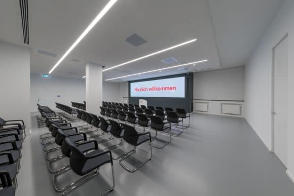 Die Räumlichkeiten in Rüsselsheim sind 440 m2 groß und verteilen sich auf zwei Stockwerke. Im Erdgeschoß können Besucher im 220 m2 großen Showroom die Bildqualität der Displays und Module aus dem aktuellen LED-Display-Portfolio live erleben und deren einfachen Aufbau selbst testen – angesteuert und mit Content versorgt werden sie von einem AV Stumpfl Wings Engine Stage Medienserver.