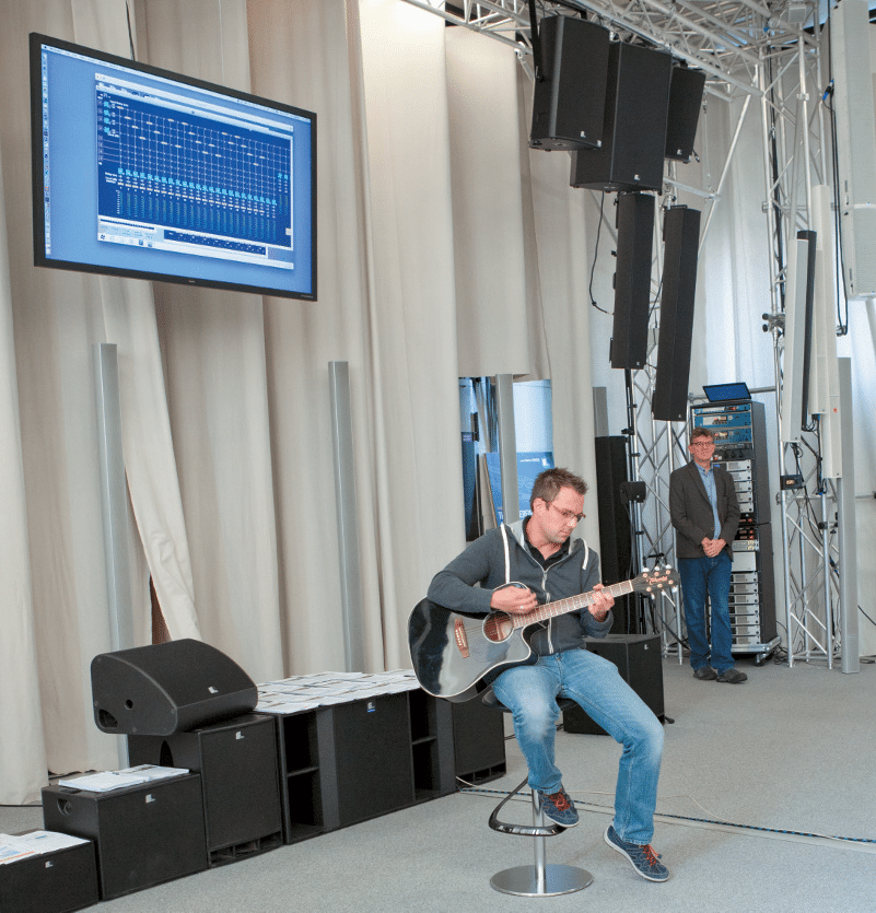 Dadurch wird das Summensignal aus Direktschall und mit den AFC3 erzeugten ersten Reflexionen lauter empfunden als nur der Direktschall in einem „trockenen“ Raum. Das Voice Lift kennt zwei Modi – den Päsentations-Modus, bei dem der Vortragende unterstützt wird und den Konferenz-Modus, bei dem Sprecher auch an unterschiedlichen Positionen im Raum verstärkt werden, ohne dass sie selber ein Mikrofon brauchen. Gerade in Sitzungssälen kann man sich gut vorstellen, dass das Anheben der Stimme per Voice Lift wesentlich angenehmer sein kann als die Ausstattung mit Mikrofonen oder Sprechstellen.