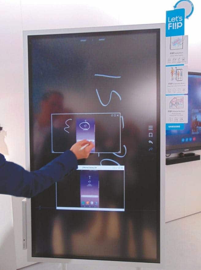 Zwar nur begrenzt collaborationfähig, aber einfach zu bedienen wie ein analoges Flipchart, ist Samsung Flip (siehe Bericht in Ausgabe 1.2018). Dieser digitale Ersatz für klassische Flipcharts bietet zusätzlich Anschlussmöglichkeiten für mobile Endgeräte, z. B. über WLAN und USB. Eine Screen- Sharing-Funktion ermöglicht Übertragung der Bildschirminhalte von kompatiblen PCs, Smartphones oder Tablets direkt auf das Samsung Flip.