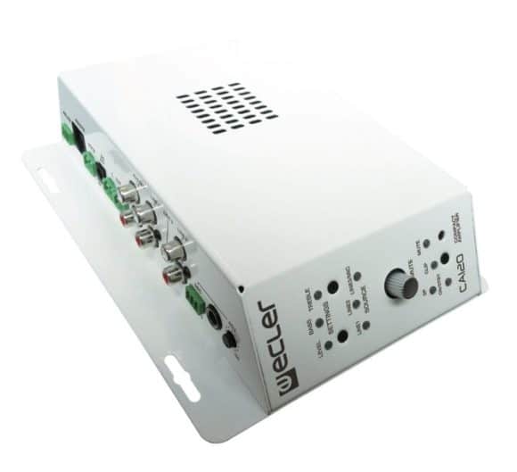 CA120 – Kleiner Stereo-Installationsverstärker mit 3 Line Eingängen (1x Mini-Klinke), Klinken-Mikrofoneingang mit Gain, 24V Spannungseingang und somit in Zwischendecken und Möbel ein- oder hinter Displays oder unter Tische baubar, RS232 sowie Remote-Port für externe Steuerung, kleiner DSP integriert für einfache Klangregelung. Ohne Remote-Steuerung und nur einem Eingang auch als Essential-Version, mit Zusatz HZ als 100V-Version sowie als eCA120DN auch mit Dante-Input erhältlich. (Bild: NEEC)