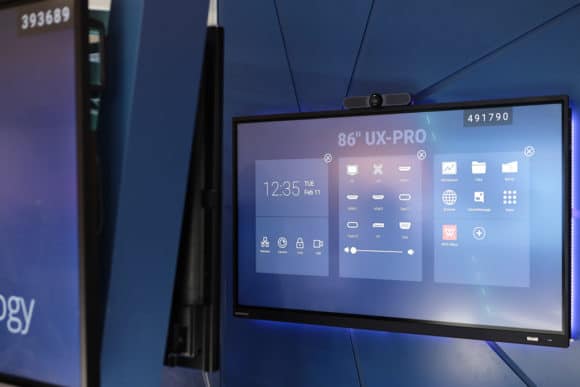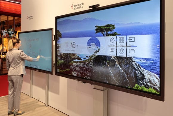 Darauf zielen auch Lösungen von Herstellern wie Kindermann oder AVtec ab, die ihre Whiteboards mit Rollen oder auch mit Hubsäulen ausstatten. Clevertouch demonstrierte seine Display-Lösung z. B. für den Bildungsbereich mit dem UX-Pro in 86″ Bildschirmgröße. Dabei setzt man auf „immersives Lernen in intelligenten digitalen Klassenzimmern“ und unterstützt die Schulen mit „kostenlosen Apps und Software, die die Anforderung des Lehrplans erfordern“.