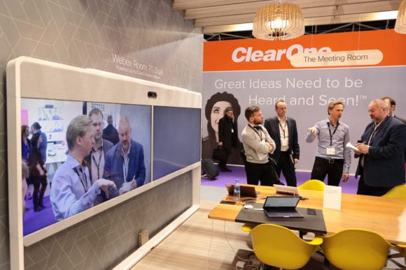Mit „Webex Room Dual 70“ demonstrierte Cisco seine Lösung für Videokonferenzen via Cloud-basierter Zusammenarbeit. Cisco bietet eigene Hardware für Videokonferenzraumlösungen an. Mit der Webex-Plattform können Meetings unabhängig von Ort, Zeit und verwendetem Eingabegerät als Web based Service erfolgen. Einzelne Teilnehmer werden über ihre eigenen Handys, Tablets oder Notebooks eingebunden, entsprechend ausgestattete Besprechungsräume ermöglichen die Zusammenarbeit von mehreren Personen an einem Ort.