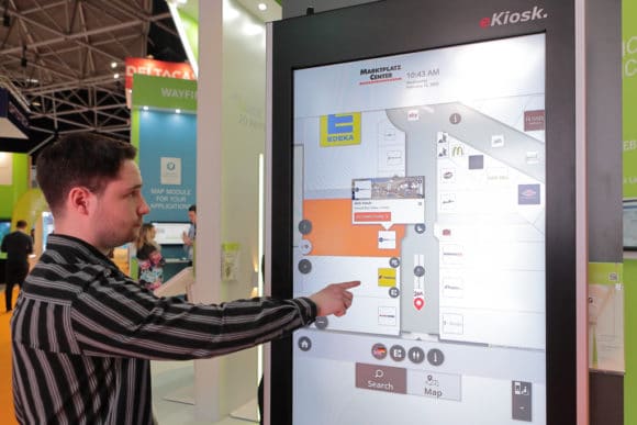 Auch das Unternehmen Dynascan zeigte eine doppelseitige Outdoor Display-Stele in 65″ mit 4.000 nit als interaktive Sonderentwicklung für die „Smart City“. Zum Beispiel für den Einsatz in Einkaufzentren zeigte der Berliner Software-Anbieter 3D-Berlin seine Lösung „Guide3D“ auf dem Gemeinschaftsstand mit der Firma eKiosk.