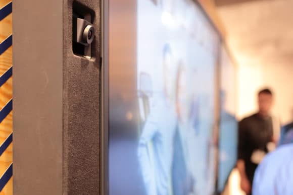 Besonderes Merkmal des NEC „InfinityBoard“ ist eine im seitlichen Rahmen integrierte bewegliche Kamera, die mit einer App ausgerichtet wird. (Bild: Dominik Roenneke)