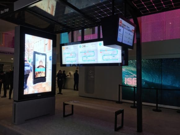 Es finden sich zum Beispiel voll digitale Bushaltestellen am Stand von LG, die einen nicht nur über die klassischen Billboards, die in Deutschland größtenteils noch mit recht analogen Citylight-Plakaten behangen werden, ausgestattet sind, sondern darüber hinaus einen voll digitalen Fahrplan bieten mit der Möglichkeit interaktiv weitere Informationen zu erlangen. Dazu darf ein weiterer doppelseitiger Monitor mit den aktuellen Linieninformationen natürlich nicht fehlen.
