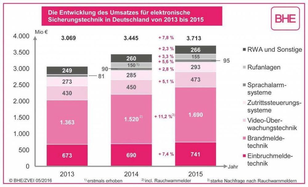 Auch in Deutschland freut sich die Branche über volle Auftragsbücher. Der Gesamtumsatz im Markt der elektronischen Sicherungstechnik stieg im Jahr 2015 um 7,8 Prozent auf 3,71 Mrd. Euro – ein neuer Bestwert. Die Umsätze im Bereich Einbruchmeldetechnik legten um 7,4 Prozent auf 741 Mio. Euro zu. Das liege vor allem am wachsenden Privatmarkt, so BHE-Chef Norbert Schaaf. Deutliche Umsatzsteigerungen erzielten außerdem die Sprachalarmanlagen (+ 5,6 Prozent auf 95 Mio. Euro) und Video-Überwachungstechniken (+ 5,1 Prozent, rund 473 Mio. Euro).