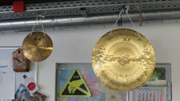 Im Großraumbüro hängen zwei Gongs, mit denen Aufträge je nach Auftragsvolumen verkündet werden. „Da zeigt sich, dass wir aus dem Verkauf kommen“, erklärt Rolf Nebel schmunzelnd. (Bild: Nicolay Ketterer)