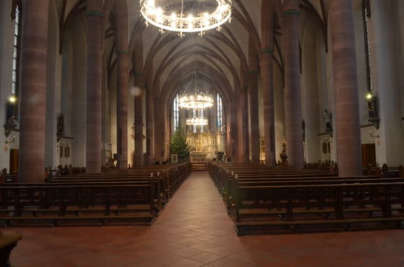 Bei Kirchen – hier die Pfarrkirche Dieburg – steht die Sprachverständlichkeit im Vordergrund. Dafür bieten sich laut Nebel beispielsweise Zeilenlautsprecher an, die auf vertikaler Ebene den Schall bündeln – und so den Raum nicht unnötig anregen. Bei der Installation wurden größtenteils d&B Säulenstrahler verbaut. (Bild: Thomann Audio Professionell)