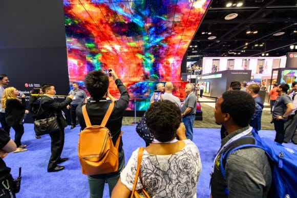 Die OLED Welle von LG beindruckte schon auf der ISE in Amsterdam Anfang des Jahres und war auch auf der Infocomm ein toller Blickfang. (Bild: Sven Schuhen)