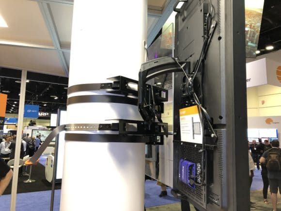 Eine clevere Halterungslösung hat Chief auf der Infocomm vorgestellt, um Displays an runden Säulen anzubringen, ohne dabei in die Säule bohren zu müssen. Hierzu werden zwei Metallbänder um die Säule gelegt und in der Halterung befestigt. Abschließend kann man die silbernen Metallbänder noch mit schwarzen, magnetischen Abdeckungen versehen. Zur Verfügbarkeit dieser neuen Lösung konnte der Hersteller noch keine Angabe machen.