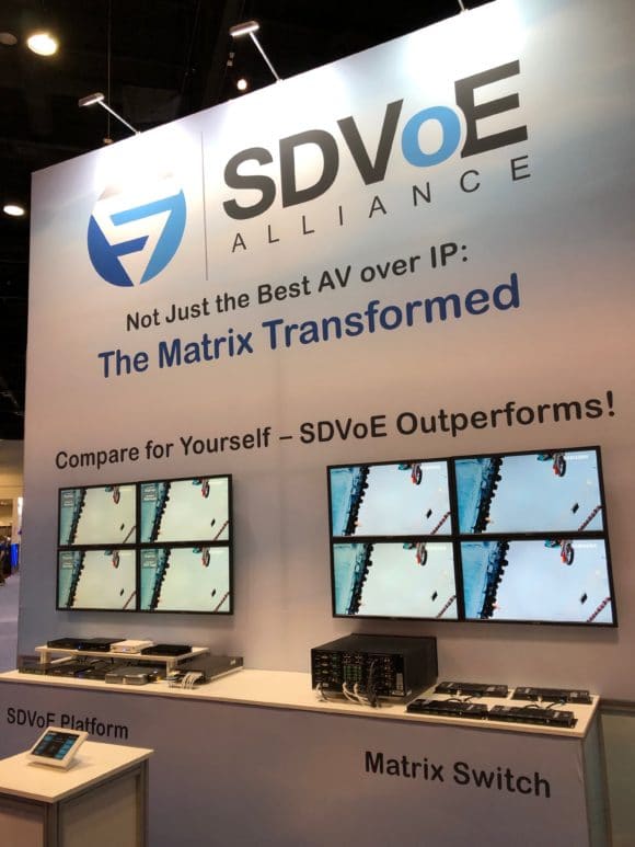 Bereits auf der ISE hat die SDVoE Alliance in Zusammenarbeit mit der Lang AG ihre Interoperabilitätsdemonstration eindrucksvoll vorgestellt. Auf der Infocomm legte der Zusammenschluss von Herstellern von AV-over-IP-Systemen mit dem Semtech Bluriver Chipsatz noch mal eine Schippe drauf. Den vier SDVoE Transmittern und Receivern von unterschiedlichen Herstellern wurde ein HDBaseT Matrix-System von Crestron gegenübergestellt. Eine zentrale Steuerung wies beide Systeme jeweils gleichzeitig an, die gleichen Umschaltvorgänge durchzuführen. SDVoE hatte in dieser Demonstration die Nase bei der Umschaltgeschwindigkeit klar vorn. Features wie den Multiviewer konnte die konventionelle Matrix dagegen nicht aufweisen. AV-over-IP-Systeme zeigen immer mehr, dass sie bisherigen Systemen mindestens ebenbürtig sind.