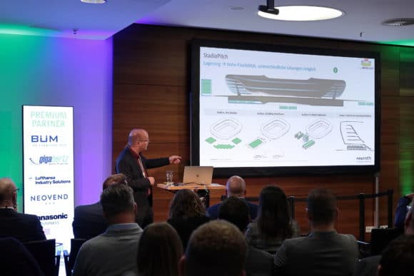 Matthias Mehling informierte im Forum „Stadion der Zukunft: Fiktionen werden wahr“ über das automatisierte Rasenaustauschsystem „Stadia Pitch“ (Bild: Dominik Roenneke)