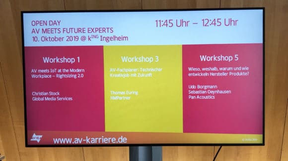 Vor allem sollte der Event den Studierenden erklären, was AV ist und worin überall AV enthalten ist. In zahlreichen Workshops wurden dedizierte Einblicke in die AV-Technik, die beruflichen Möglichkeiten sowie in Themen gegeben, mit der sich die Branche in Zukunft vermehrt beschäftigen wird. Es ging um die Fragen, warum AV beim Thema Modern Workplace von zentraler Bedeutung ist, warum ein Medientechniker auch ein guter Koch sein sollte, was ein Fachplaner macht, was man für eine Planung alles braucht und wie man für komplexe Probleme die richtigen Lösungen findet.