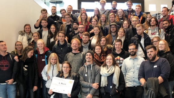 Gruppenbild der etwa 70 angereisten Studierenden der THM Giessen des Studiengangs Eventmanagement und Eventtechnik, unter denen sich auch die glückliche Gewinnerin der Reise zur ISE in Amsterdam befindet. (Bild: Sven Schuhen)