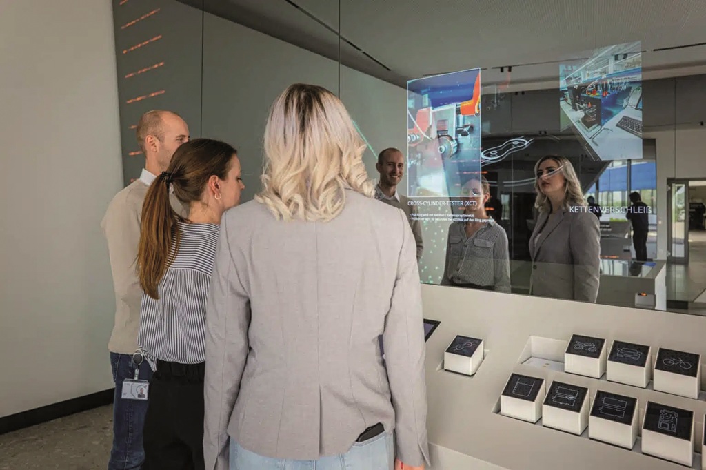 Optisch erweitert wird diese Präsentationsumgebung durch die Spiegelflächen zu beiden Seiten der Projektion. Hinter diesen befinden sich Hochleistungs-LEDs sowie ein besonders kontraststarker Monitor im Sonderformat, auf dem der Geschäftsführer als lebensgroßer Avatar erscheint und die Besucher begrüßt.