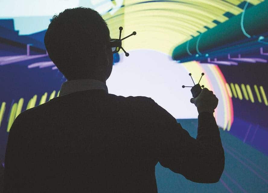 In Anbetracht der Projektionswand von 6 x 3,18 m, die eine entsprechende Bildgröße zulässt, war ein Projektor mit sehr hoher Auflösung und Lichtleistung erforderlich, um auch kleinste Details noch gut „heranzoomen“ und bearbeiten zu können. Diese Aufgabe löst im VR-Labor ein Christie Mirage 304K Aktiv-Stereo-Projektor, der native 4K-Inhalte in 3D mit einer Bildwiederholfrequenz von 120 Hz wiedergeben kann. Der Projektor ist mit einem 0,9:1-Objektiv mit fester Brennweite bestückt, um die Projektions-einheit nahe genug an der Scheibe zu positionieren, ohne Bildverzerrungen zu riskieren. Eric Küpper, Managing Director bei Viscon, erwähnt neben der hohen Leistungsfähigkeit des Projektormodells auch die Beschaffenheit des Lampensystems als einen der Entscheidungsgründe: „… darüber hinaus verfügt der Christie Mirage 304K über ein modulares Lampensystem. Somit ist eine Ausfallsicherheit gegeben, die bei 1-Lampen-Geräten nicht gegeben ist. Das ist insoweit sehr wichtig, da die VR-Anlage von unterschiedlichen Unternehmen und primär von technisch ungeschulten Anwendern genutzt wird.“