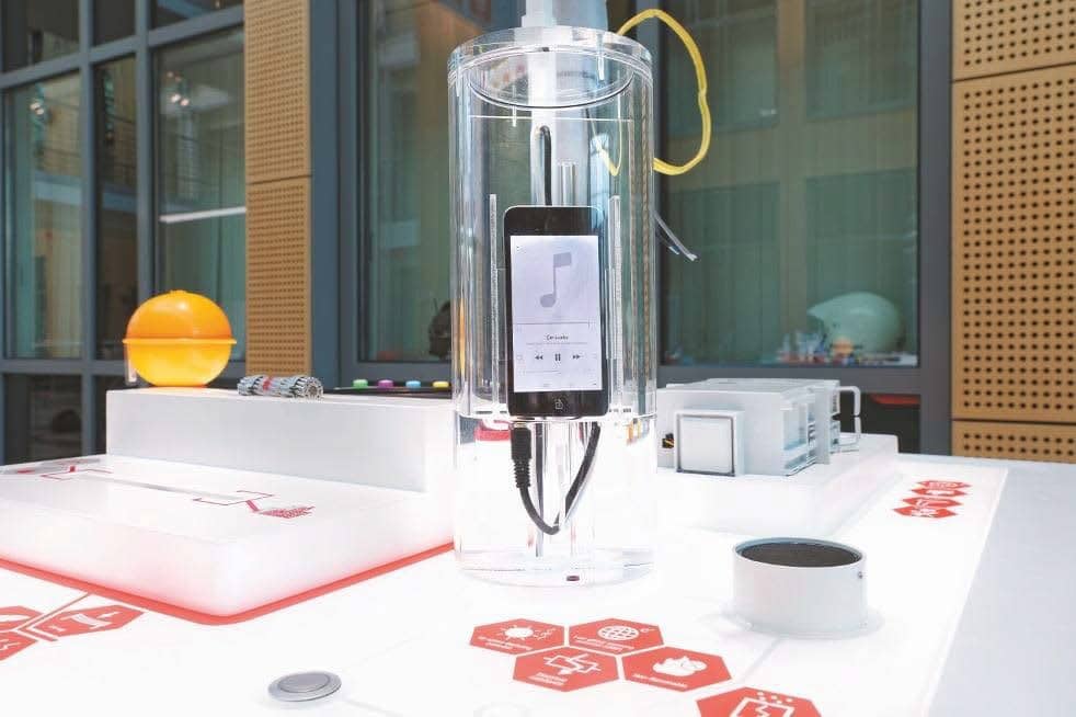 Wasser sprudelt in einen Plexiglaszylinder und umspült nach kurzer Zeit einen darin befindlichen Apple iPod, der munter vor sich hin dudelt. Ein abrupter Wiedergabestopp nebst Komplettversagen des elektronischen Gerätes bleibt zur Verwunderung der Betrachter jedoch aus: „Das ist sozusagen trockenes Wasser …“, merkt Industriekaufmann Jannik Werkmeister an. Das „Wasser“ im Plexiglaszylinder ist eine perfluorierte chemische Verbindung ohne elektrische Leitfähigkeit namens „Novec“. Die Entwicklung von 3M wird in der Industrie u. a. als Brandschutz-, Kühl- und Reinigungsmittel eingesetzt. Werkmeister ist als „Junior Specialist Kommunikation und Kunden-Marken-Erlebnis“ bei der 3M Deutschland GmbH gemeinsam mit seinem Kollegen Sebastian Schrörs, Leiter Interne Kommunikation und Kunden- Marken-Erlebnis, erster Ansprechpartner für Gäste, die bei einem Besuch am Hauptsitz in Neuss mehr über das Technologieunternehmen und seine Produkte erfahren möchten. Teil der Markenerfahrung ist dabei fast immer ein Aufenthalt im 3M Customer Inspiration Lab, das sich als technisch und inhaltlich perfekt auf das Unternehmen abgestimmte Präsentationsform für die 3M-Technologien und -Märkte erweist.