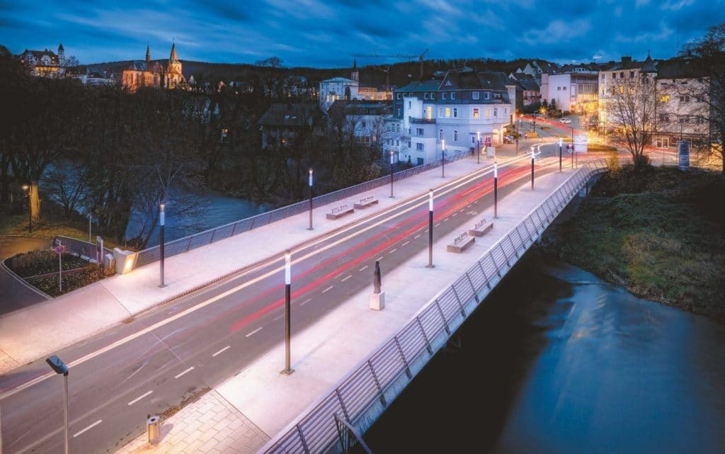 Das Ziel der neuen Beleuchtungslösung war es, das Straßenbild auf vielfältige Art und Weise aufzuwerten und somit die Aufenthaltsqualität zu steigern. Arnsberg sieht sich als zukunftsorientierte Stadt, so dass eine moderne Straßenbeleuchtung, die auch in späteren Jahren ausreichend Potenzial zur vielschichtigen Vernetzung bietet, in den Plänen von Anfang an eine tragende Rolle spielte. Für den Hersteller Trilux stellte diese Aufgabe ein echtes Heimspiel dar: Die Arnsberger Leuchtenfirma stattete im Rahmen der umfangreichen Neugestaltung der Ruhrstraße, des Brückenplatzes und der Klosterbrücke den Übergangsbereich von der Neustadt zur Arnsberger Altstadt mit LED-Leuchten aus.