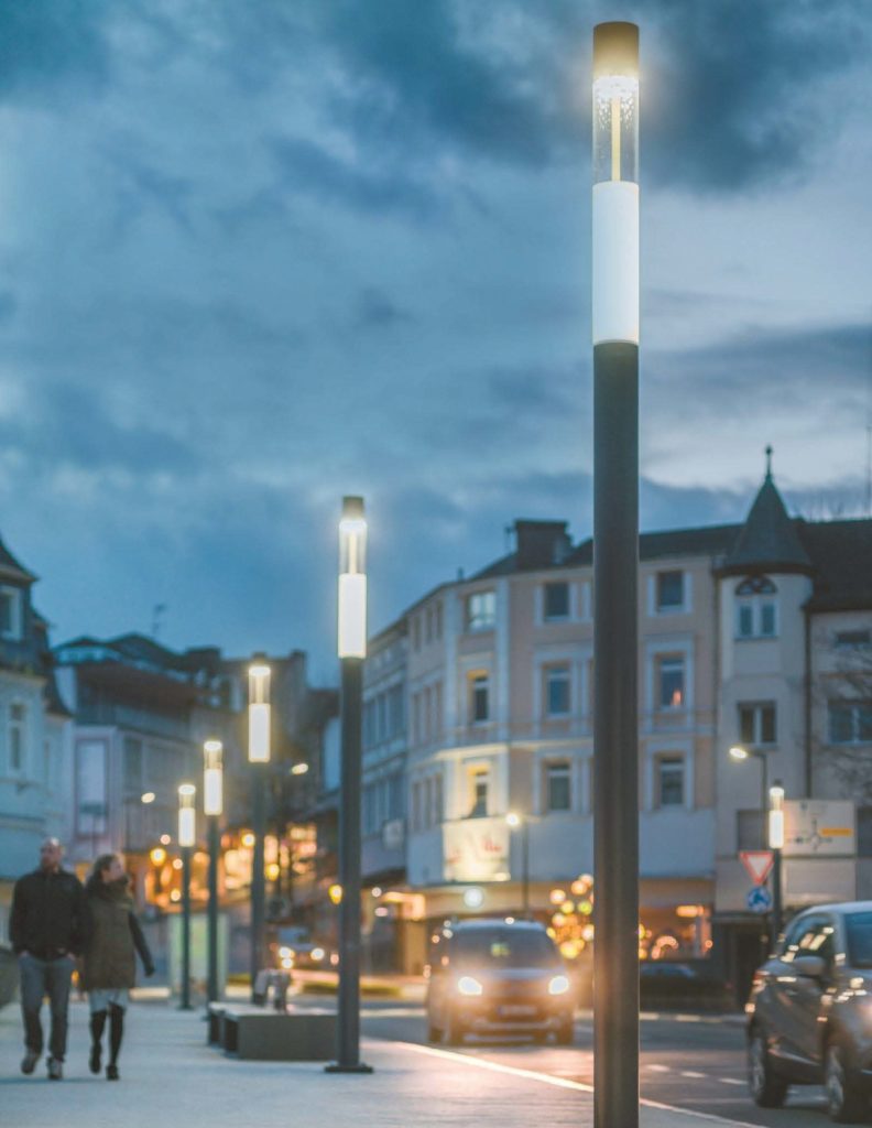 Nicht nur die Straßenbeleuchtung unterliegt hohen Anforderungen, sondern auch die Illumination innerstädtischer Bereiche. Mit dem modularen Lichtstelensystem ConStela, das mit dem Design Plus Award ausgezeichnet wurde, hat Trilux die Möglichkeit geschaffen, die Leuchte passend in das Stadtbild zu integrieren. Öffentliche Bereiche und Plätze setzt die akzentuierende Lichtwirkung in Szene und schafft gleichzeitig eine Wohlfühlatmosphäre. Die Auswahl verschiedener Leuchtenmodule bietet eine individuelle Anpassung an das jeweilige Umfeld.