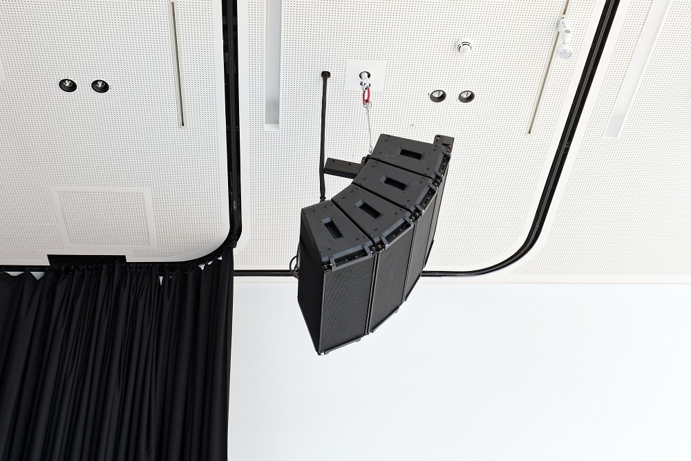 Die weiter unten im Array zum Einsatz kommenden Module weisen schräg in Richtung des Parketts und decken den Publikumsbereich bereits kurz vor der Bühne breitflächig ab. Weiter oben im Array erfolgt eine stärkere Bündelung, so dass der hintere Bereich des Saals ohne größere Verluste ins Visier genommen werden kann. Tontechniker registrieren bei der Viererkonstellation eine gute Dämpfung unterhalb der Arrays sowie dahinter. „Der Beam der Arrays ist derart ausgerichtet, dass möglichst wenige Schallanteile gegen die reflektierende Fensterfront auf der gegenüberliegenden Seite treffen“, erklärt ASC Projektleiter Damian Mucko. „Beschallt wird somit vorrangig der Bereich, in dem sich die Zuhörer aufhalten.“