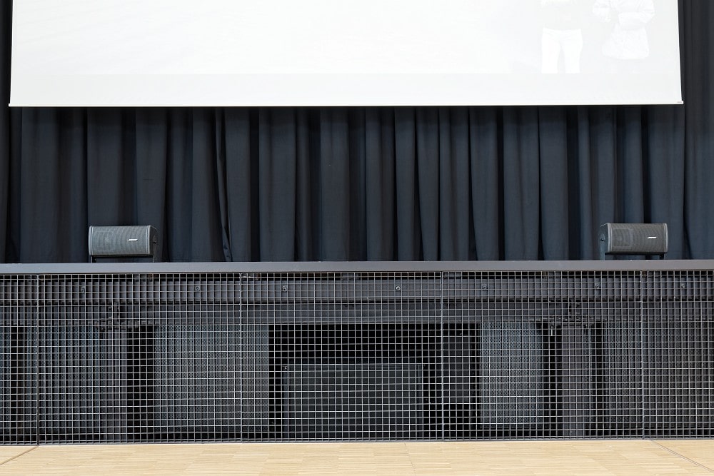 Im Großen Saal des WBZ Ingelheim wurde erstmals in Deutschland ein von Bose Professional zum Ende des Jahres 2016 vorgestelltes ShowMatch-Beschallungssystem installiert – vom ursprünglich vorgesehenen System eines anderen Herstellers wurde im Verlauf der Planung mit Gedanken an die stark variierenden Nutzungsszenarien in Absprache mit dem Kunden Abstand genommen. Im ersten Moment könnte man vermuten, dass statt ShowMatch die RoomMatch-Lösungen aus dem Portfolio von Bose aufgrund ihrer spezifischen Auslegung für die Festinstallation eine geeignetere Wahl gewesen wären. ASC-Projektleiter Damian Mucko weist in diesem Zusammenhang auf die besonders kompakten Abmessungen der Bose Professional ShowMatch DeltaQ Array-Lautsprecher hin – und in der Tat treten die schwarz lackierten Vierer-Arrays im Großen Saal des WBZ Ingelheim visuell lediglich dezent in Erscheinung.