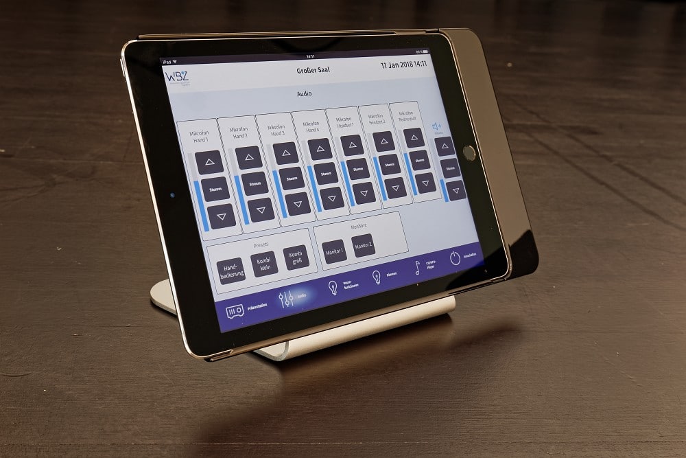 Für eine vereinfachte Bedienung der Ton- und Medientechnik sowie den Zugriff auf die wichtigsten Raumfunktionen ist im Großen Saal ein Apple iPad mit Crestron App und IDOCK Design-Tischgehäuse verfügbar, auf das Referenten gerne zurückgreifen. Die von ASC programmierte Bedienoberfläche ist übersichtlich strukturiert und stellt auch technisch weniger versierte Anwender vor keine größeren Probleme, wie Christel Bieger und Florian Pfeil übereinstimmend berichten. „Die Bedienung mit dem Tablet gestaltet sich absolut angenehm“, sagt der WBZ-Geschäftsführer. „Wenn ich im Großen Saal eine Sprachveranstaltung betreue, muss ich das Mischpult nicht unbedingt in Anspruch nehmen.“