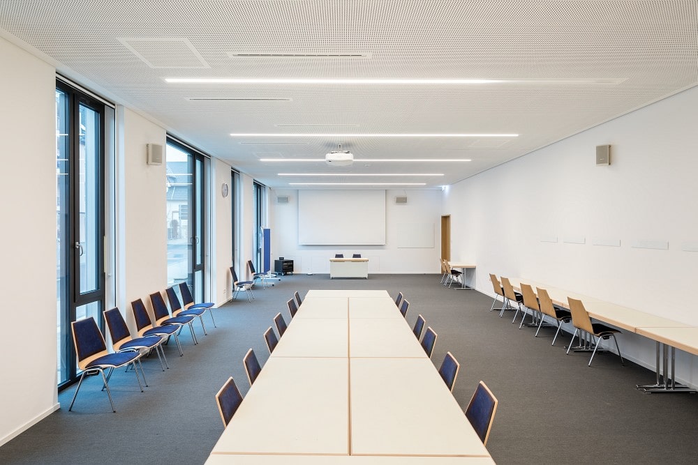 In Ingelheim trifft der WBZ-Neubau durchweg auf positive Resonanz: Das Haus vervollständigt harmonisch das Gebäudeensemble am innerstädtischen Neuen Markt, und für die vielfältigen Aktivitäten der Jugend- und Erwachsenenbildung ist deutlich mehr Platz als am früheren Standort vorhanden. „Der Große Saal wird nicht nur stark frequentiert und multifunktional genutzt, sondern er ist auch so etwas wie unsere gute Stube“, sagt Dr. Florian Pfeil. „Die großflächige Verglasung mag rein auf die Musikwiedergabe bezogen zwar nicht ganz optimal sein, aber für uns war es wichtig, dass die Menschen, die hier am Haus vorbeigehen, den Saal als Schaufenster des WBZ wahrnehmen. Die Ingelheimer Bürger finanzieren durch ihre Steuern das Weiterbildungszentrum mit und sollen sehen, dass in unserem Haus immer etwas los ist – diesen Aspekt muss man auf jeden Fall berücksichtigen, um den Charakter des Großen Saals zu verstehen.“ // [4001]