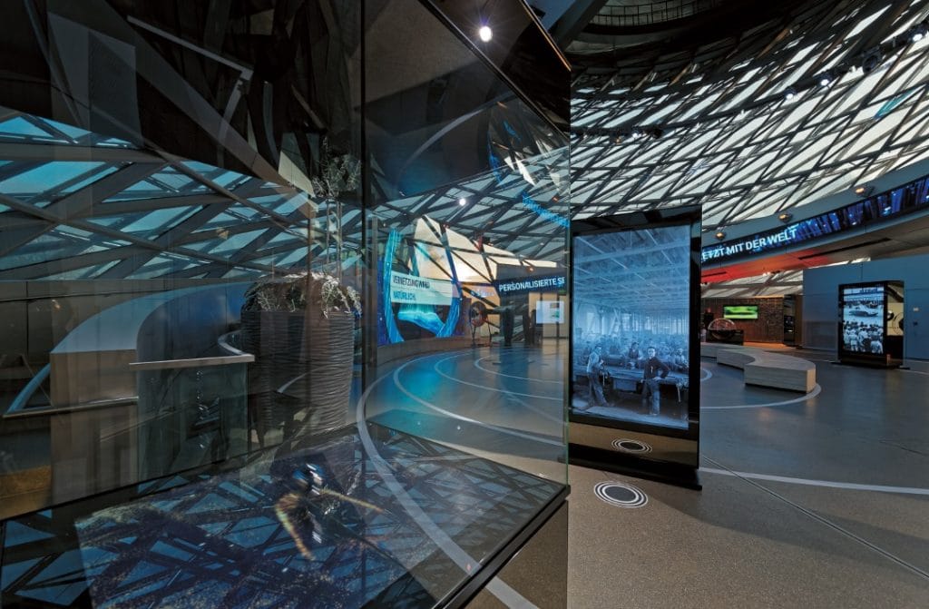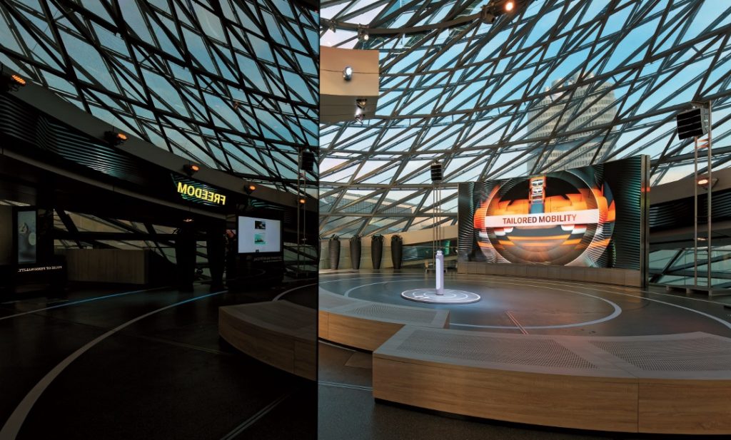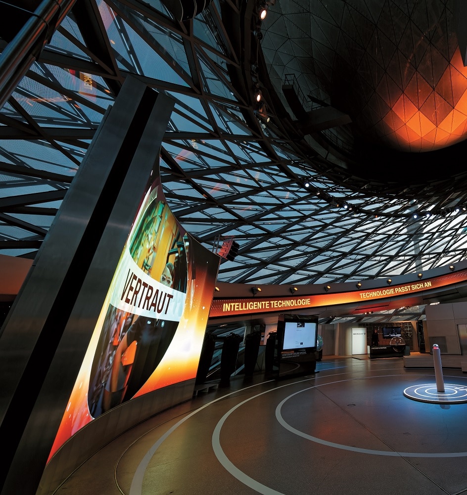 Die große gerundete LED-Bildwand ist mit eigens für sie produzierten 4K-Inhalten ein visueller Hochgenuss, der von einem LED-Streifen entlang des spindelförmigen Aufgangs schwungvoll fortgeführt wird. Der hypnotische Ambient-Sound ist umhüllend und trotz vieler schallharter Flächen ist zugespielte Sprache gut verständlich. Durch die Fenster wird der Blick auf den BMW Vierzylinder mit seinem hinterleuchteten XXL-Propellerlogo frei und auf der anderen Seite erhebt sich im Gegenlicht majestätisch die prägnante Dachsilhouette des Münchner Olympiastadions.