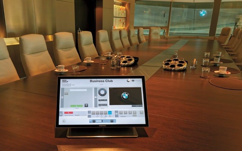 Für den Business Club wurde von Kraftwerk eine formschöne Sonderhalterung gefertigt, mit deren Hilfe die berührungsempfindliche Oberfläche des Crestron Touchpanels ergonomisch angenehm auf dem Konferenztisch aufgestellt ist. (Bild: Jörg Küster )