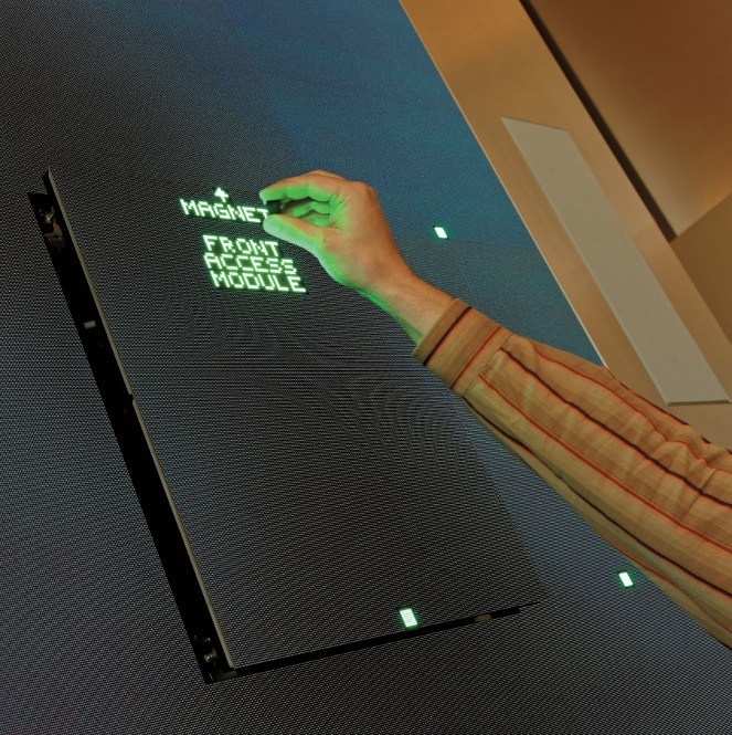 Für die LED-Wall im Business Club wurde ein wartungsfreundlicher Front-Access eingerichtet: Die Panels lassen sich für Servicezwecke mithilfe eines Magneten wie von Geisterhand nach vorne ausfahren – im Hintergrund arbeitet das Barco X-series Motorized Front Access Kit, dessen Einsatz im konkreten Kontext aufgrund der geringen vorhandenen Einbautiefe sinnvoll ist. Eine Crestron DM-MD16x16-RPS Videomatrix ist in der zugehörigen Technikzentrale untergebracht und nimmt über Digital-Media Bildsignale mit einer Auflösung von bis zu 4K entgegen.