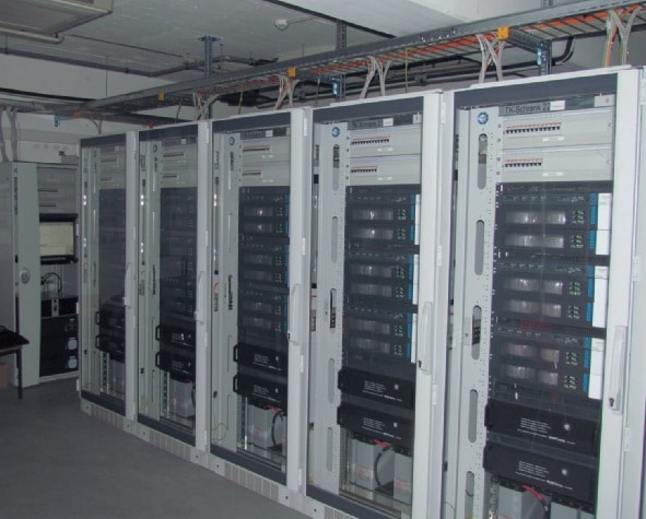 Auch hier hat das Prinzip der Doppelung gegriffen, das bedeutet, es wurden zwei Online-USVs eingesetzt. Man hätte ohnehin zwei benötigt, da der Einschaltstrom der Aktivzeilen so hoch ist, dass eine Online-USV zusammengebrochen wäre. Jede Aktivzeile wurde von uns einzeln abgesichert und wird einzeln von einem Zeitrelais angeschaltet, um den zu liefernden Ausgangsstrom der Online-USV so gering wie möglich zu halten.