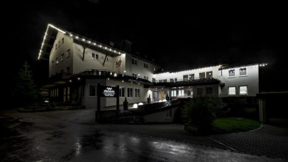 Der erste Anblick, der sich den anreisenden Gästen bietet, ist die Außenansicht des Hotels. Insbesondere in den Dämmerungs- und Abendstunden spielt demzufolge die Beleuchtung an dieser Stelle eine signifikante Rolle, um visuell von Anfang an zu begeistern. Zurückhaltend und unauffällig stellt sich das Hotel mit beleuchtetem Dachstuhl und am Eingang befindlichen Kugelleuchten dar. Eine großzügige Terrasse mit einem daran anschließenden Gebäudetrakt wird wirkungsvoll über Up-/Down-Wandleuchten und auf den Freiflächen dekorativ verteilten Kugelleuchten in unterschiedlichen Größen beleuchtet.