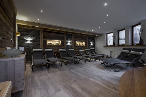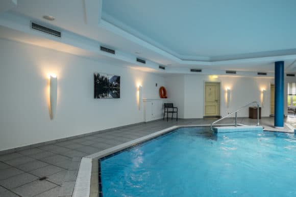 Das mit kristallklarem Bergwasser gefüllte Schwimmbad wird durch schlanke Gipsleuchten an den umlaufenden Wänden beleuchtet und erlaubt so im Wasser oder auf den zahlreichen Liegen einen entspannten Aufenthalt. Die Beleuchtung unter Wasser bewirkt, dass sich an der weißen Decke ein blauer Lichtreflex bildet, der sich sanft über den gesamten Raum verteilt.
