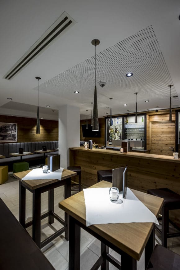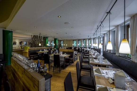 Im hinteren Teil befindet sich ein besonderer Raum mit einer außergewöhnlich hohen, gewölbten und holzvertäfelten Decke, die einen luxuriösen und erhabenen Eindruck bei den Gästen hinterlässt. An warmen Sommertagen ermöglicht die angrenzende Terrasse mit freiem Blick auf die Berglandschaft, den kulinarischen Genuss im Freien fortzusetzen, und kann aufgrund der dezenten, aber wirkungsvollen Außenbeleuchtung, bestehend aus Wand- und Kugelleuchten, bis in die späten Abendstunden fortgesetzt werden. Das Ambiente ist den kulinarischen Versprechen angepasst und weiß in der Gesamtwirkung zu überzeugen, so dass sich dort die nationalen und internationalen Speisen und Getränke genießen lassen.