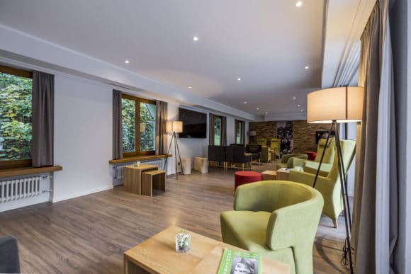 Etwas anders wirkt da die Gästelounge, die vielfältige Möglichkeiten der kommunikativen Beschäftigung bietet. Die Gestaltung orientiert sich formal an den Gästezimmern, besteht also aus einer Mischung aus Stehleuchten, Einbaustrahlern und Wandleuchten und kann so ganz auf die Notwendigkeiten angepasst werden. Die beinahe vollflächige Fensterfront garantiert einen freundlichen und hohen Tageslichtanteil und erlaubt einen ungehinderten Ausblick auf das Trettachtal im Nationalpark der Allgäuer Alpen.