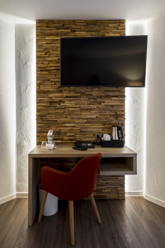 Die TV-Wände in den jeweiligen Zimmern sind zwar unterschiedlich gestaltet, jedoch alle mit einem LED-Profil von MBN Proled hinterleuchtet. Dadurch entsteht ein warmes, indirektes Licht im Raum, welches nicht nur für Fernsehabende sinnvoll zu nutzen ist. (Bild: Alexander Schwarz)