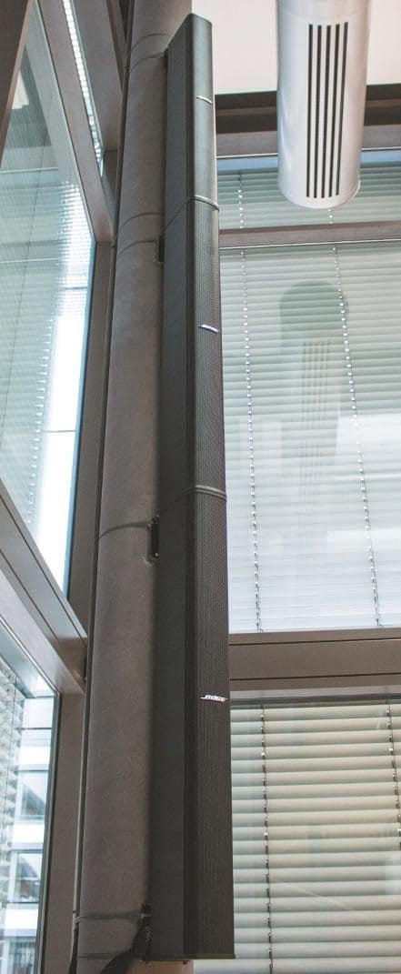 Mit ihren akustischen und technischen Eigenschaften sind die Bose MSA12X wie für diesen Raum konzipiert. Es ist immer eine komplexe Situation, ein Konzept zu ändern, das einmal durch einen Planer erarbeitet wurde. Dennoch haben wir an dieser Stelle zu dritt produktiv zusammengesessen und uns gemeinsam auf diese Lösung geeinigt. Das Ergebnis, denke ich, spricht für sich.“ Angefertigt wurde außerdem eine Fotomontage, auf der ein zu erwartender optischer Eindruck zu sehen war. Im konkreten Fall durften außerdem auch die Säulen nicht angebohrt werden, da man nur Mieter ist – daher eine Montage mit Schellen.