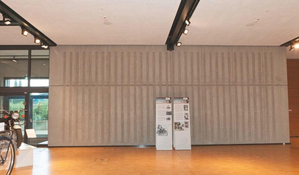 Die Rückwand ist vertikal leicht strukturiert und hat in die Betonwand integrierte, schallabsorbierende Flächen. (Bild: Christiane Bangert)