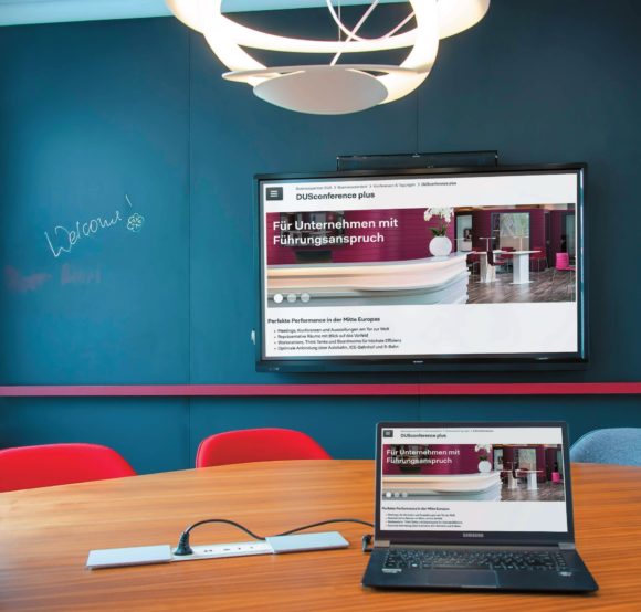 Das DUSconference plus ist mit zehn Konferenz- und Tagungsräumen für bis zu 300 Personen ausgestattet, die sich teilweise kombinieren lassen. So bieten die beiden großen Tagungsräume für bis zu 176 Personen Platz. In diesen Räumen sind Sony-Projektoren des Typs FH65 und FH60 in jeweils einem Kindermann- Deckenlift für die Großbilddarstellung installiert. An den Seiten befinden sich zusätzlich zwei 65-Zoll-Displays von Sony. Wird der Raum über eine Faltwand mit einem weiteren Konferenzraum vergrößert, stehen in diesem noch einmal zwei Displays für die Bildwiedergabe in den hinteren Reihen zur Verfügung.