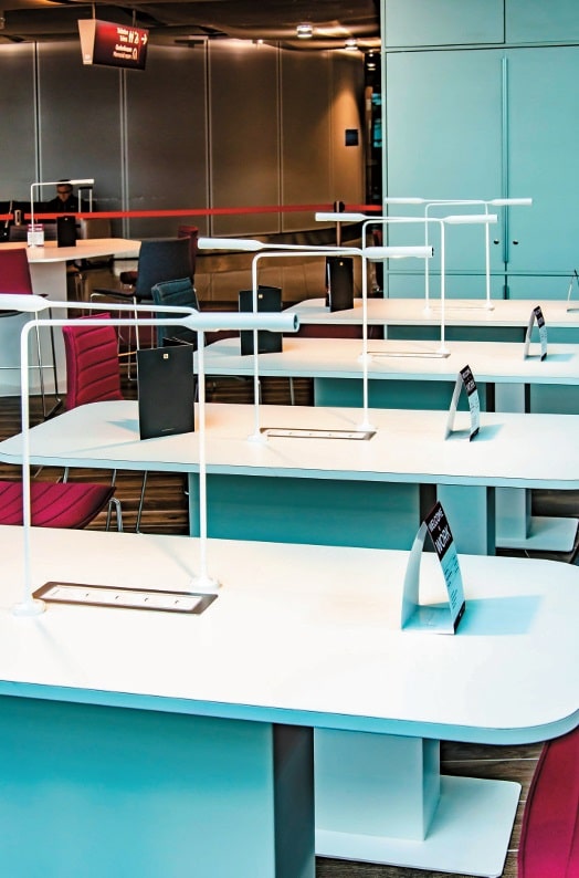 Für Reisende, die nur ganz kurz etwas besprechen wollen, bietet das Konferenzcenter sogenannte Web-Corner, Plug-in Workstations oder Think Tanks an. Das sind Huddle Spaces mit Platz für bis zu vier Personen, die ihre digitalen Informationen über 43-Zoll-Displays von Sony und Barco ClickShare CSE-200 austauschen können.