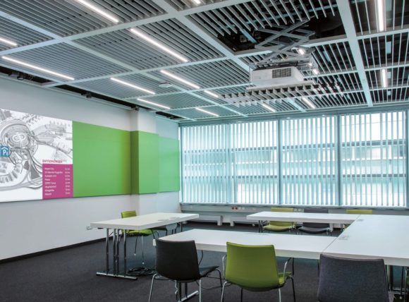 In den kleineren Seminarräumen befinden sich je nach Größe Projektionsmöglichkeiten entweder mit kleineren Sony-Projektoren oder mobile 75-Zoll-Displays vom Typ Sony FWL-75W855C, die auf einen Conen Displaywagen vom Typ SCETAC montiert sind. In jedem zweiten Tisch des Konferenzcenters befinden sich CablePort frame Stromanschlussfelder von Kindermann – insgesamt wurden hier 200 Tischanschlussfelder verbaut. Von Kindermann wurden auch Komponenten der Audioanlage in den großen Tagungsräumen geliefert. Die Mikrofone stammen von Mipro, ebenso die Empfänger. Die Deckenlautsprecher und die Audiomatrix stammen von Extron. Die Audimatrix-Systeme erlauben dem Konferenzzentrum eine einfache Einrichtung und Raumoptimierung sowie Steuerung der Audiosignale. In den Tagungsräumen- und Konferenzräumen dienen Polycom Trio Konferenztelefone als Sprachrohr zur Außenwelt.