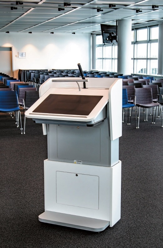 In beiden großen Tagungsräumen sind hochwertige Kindermann Speechpoint Design- Rednerpulte aufgestellt. Sie sind höhenverstellbar und damit auch von Rollstuhlfahrern nutzbar. Werksseitig wurden sie mit zukunftssicheren Anschlüssen ausgestattet und besitzen ein integriertes Kabelmanagement. Außerdem sind sie vorne mit Standfüssen und auf der Rednerseite mit Rollen versehen, so dass sie sich innerhalb des Raums flexibel aufstellen lassen.