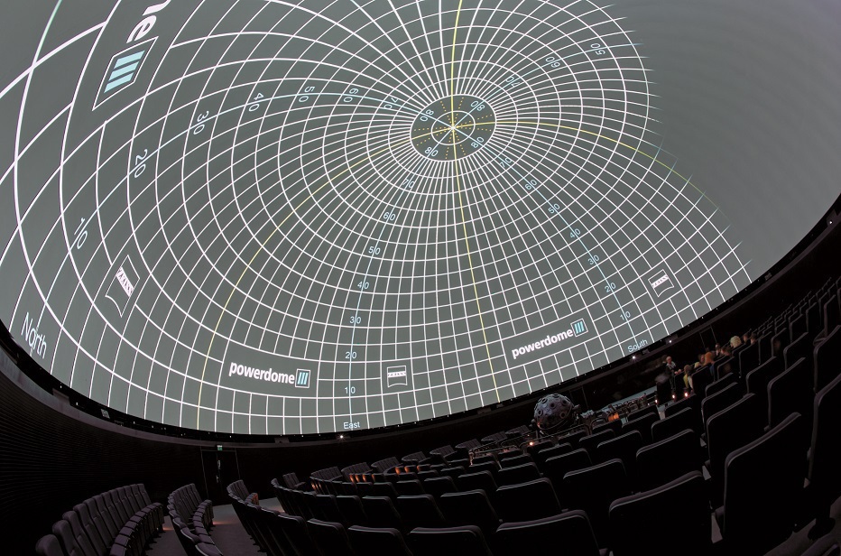 Neben dem Zeiss-Sternenprojektor werden als Bildlieferanten zehn umlaufend im Kuppelrand angebrachte Zeiss powerdome VELVET DLP-Projektoren herangezogen – hier ein Testbild. (Bild: Jörg Küster)