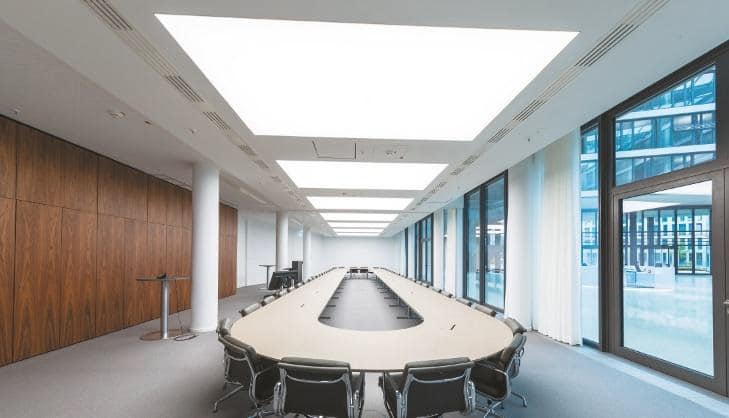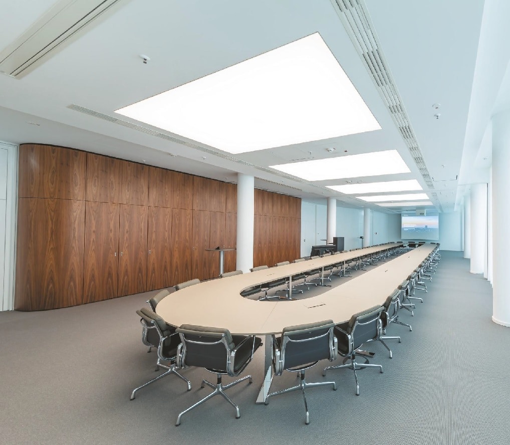 Perfekt ins Bild passt im Großen Konferenzsaal der Verzicht auf konventionelle Lautsprecher: Für die Beschallung sind in die Decke eingelassene Novasonar-Biegewellenwandler (MLAudio und Carbons) zuständig, die bei der Wiedergabe tiefer Frequenzen durch sieben ebenfalls unsichtbar oberhalb der Leuchten angebrachte JBL Subwoofer Control 19CS unterstützt werden.