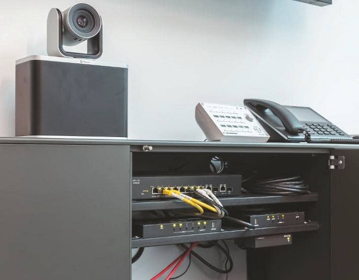 Die übrige Technik wird erst nach dem Öffnen einer Schranktüre sichtbar: Ein Cisco SG300-10PP Switch, ein Crestron HD-MD4x2-4K-E HDMI-Switcher, ein Crestron HD-MD-400C und ein Extron Transmitter (DTP HDMI 230 Tx) sind zu sehen. Bezüglich der Konnektivität wird in den Tischanschlussfeldern von Kindermann alles geboten, was der Markt derzeit verlangt – und sogar die inzwischen ein wenig in die Jahre gekommene VGA-Schnittstelle wird weiterhin unterstützt.